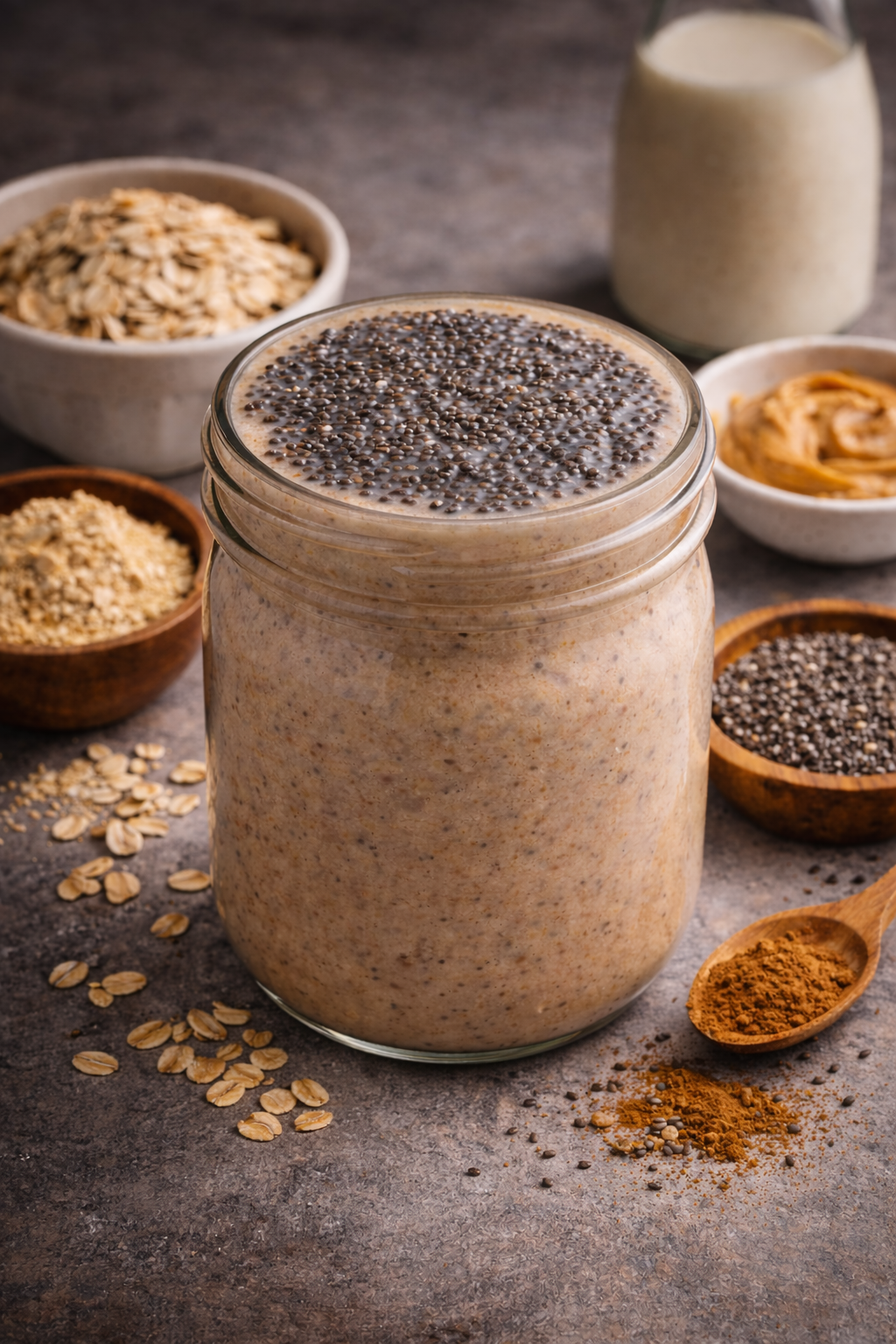 Creamy almond milk or A2 milk forms the base, blended with hearty oats, protein-rich sattu powder, and a spoon of peanut butter for natural satiety. A gentle touch of Ceylon cinnamon adds warmth, while soaked chia seeds are folded in for fiber, omega-3s, and texture—creating a smooth yet satisfying finish.